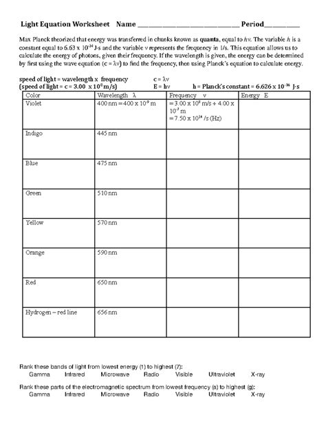 Web light worksheet #3 useful equations max planck theorized that energy was transferred in chunks known as quanta, e ual to lav. Web chapter 21 light intensity practice worksheet light is a form of energy. Web peed of light [and all electromagnetic spectrum waves] (c) = 3.0 x 108 m/s.