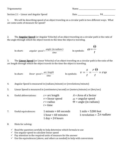 Worksheets Are Pre Calculus Arc Length Linearangular Velocity Notes, Angular Velocity, Grosse Pointe Public.