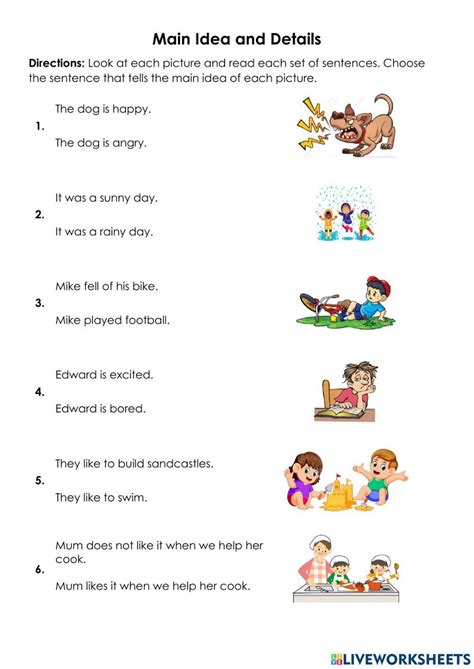 Main Idea Worksheet Grade 2. Students will use pictures, sentences and paragraphs to identify the main idea and supporting details. Select one or more questions using the checkboxes above each question.