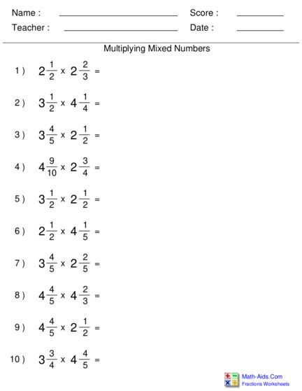 Math Multiplying Mixed Numbers Worksheet. Multiplying mixed numbers by proper fractions. Convert all mixed numbers into improper fractions (improper fraction is a fraction in which the top number is bigger than bottom number):